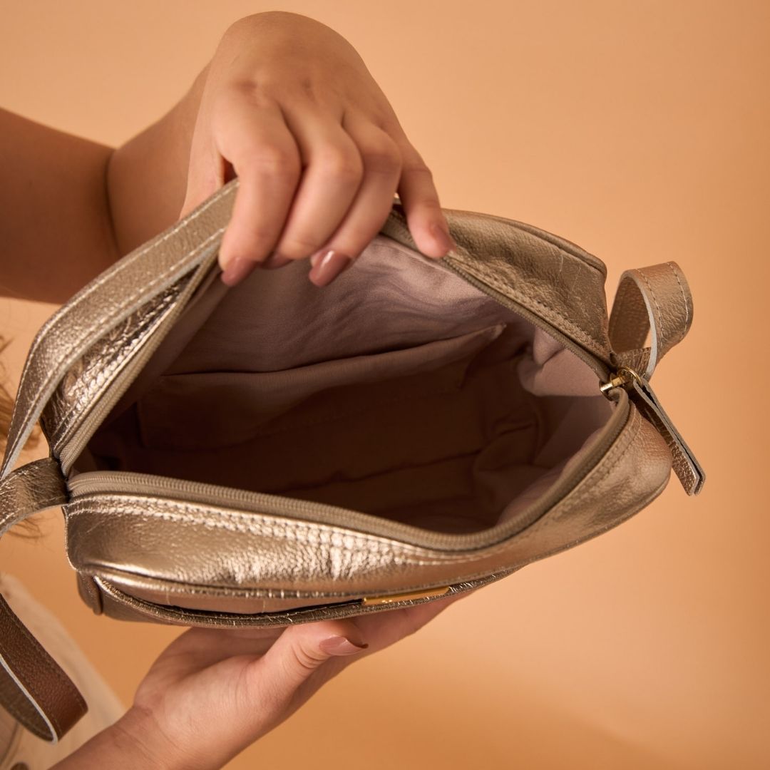 Enquanto isso, o compartimento principal com zíper possui espaço interno amplo, permitindo guardar carteira, celular, maquiagem e outros itens essenciais do cotidiano.
