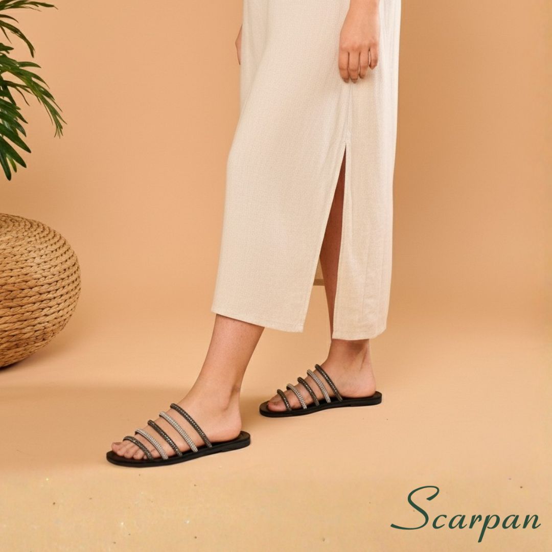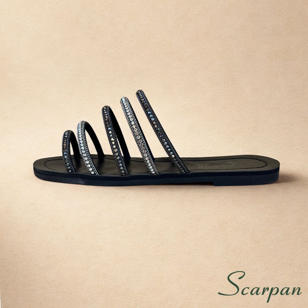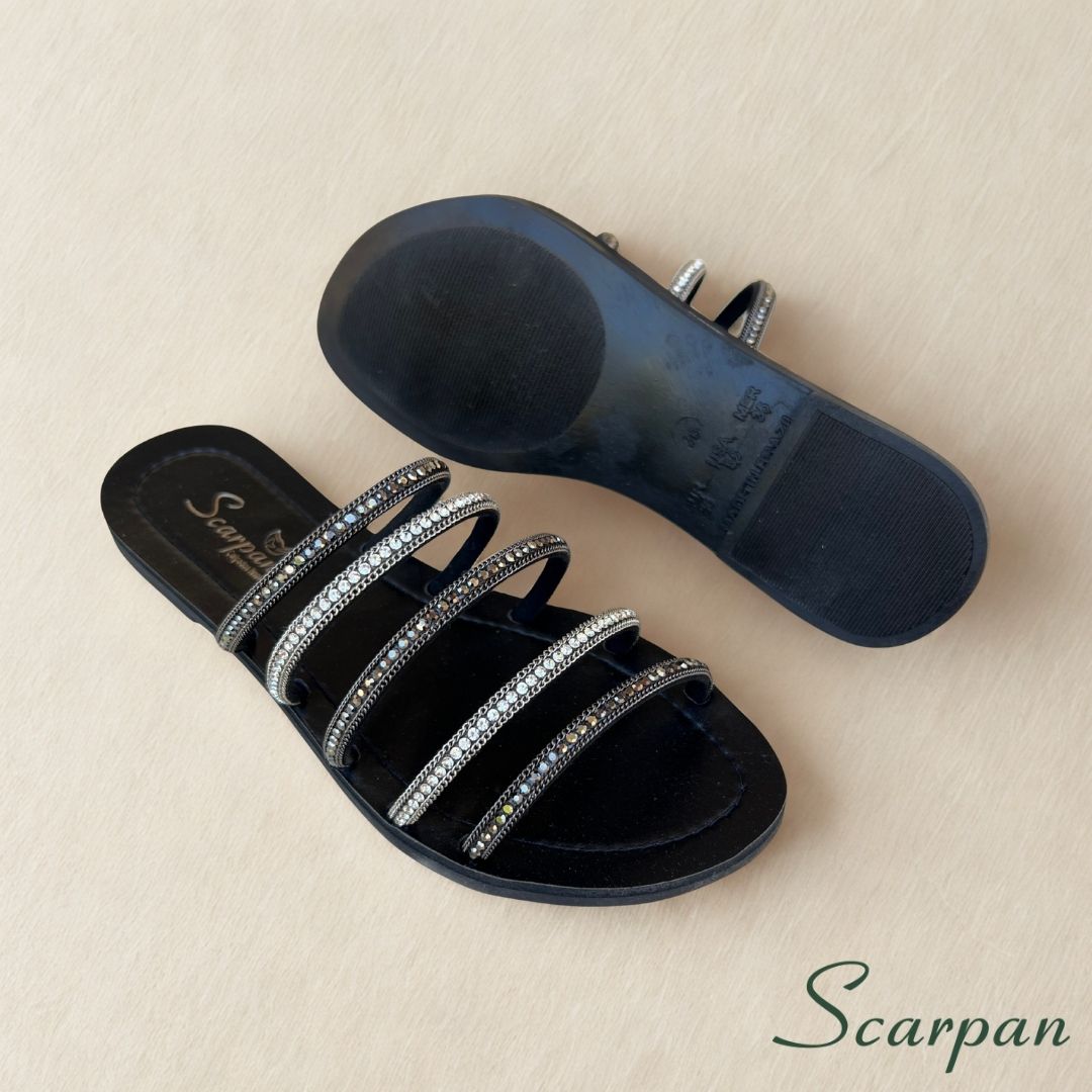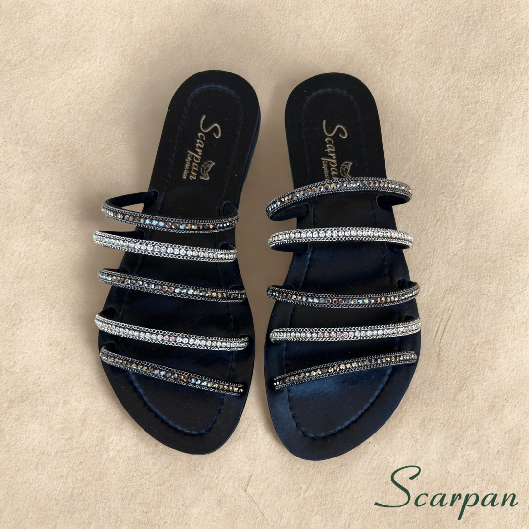 A Sandália Rasteira Preta com Strass da Scarpan é Elegante e combina a atemporalidade do preto e o luxo das pedrarias. Criamos esta sandália para a mulher que deseja um calçado sofisticado, prático e incrivelmente versátil. Portanto, este modelo eleva o seu visual facilmente, servindo bem em ocasiões casuais ou em eventos formais durante o dia.