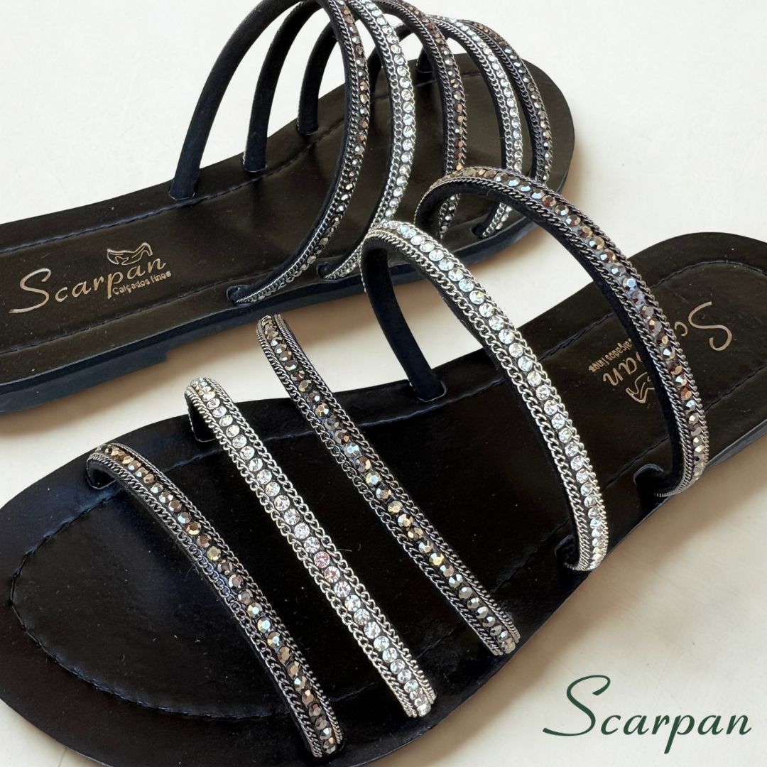 Na Scarpan, o conforto é um item de luxo acessível. Afinal, o foco da marca está em sempre trazer material de qualidade e preço justo. Construímos esta Sandália Rasteira Preta Strass pensando no seu bem-estar: