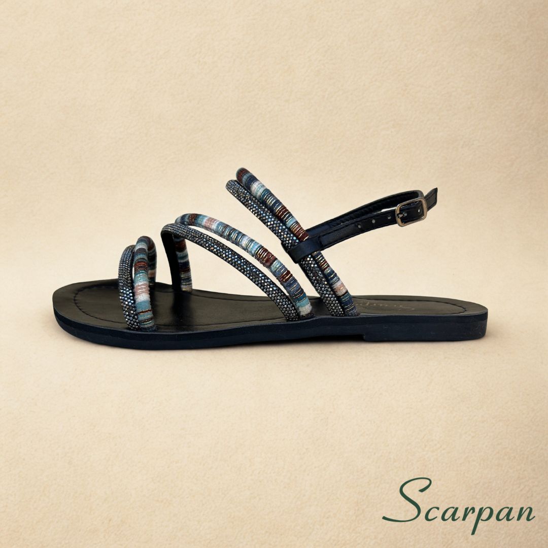 Sandália Rasteira Preta Colorida com Strass – Elegância Clássica com Toque Boho